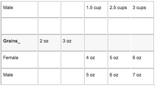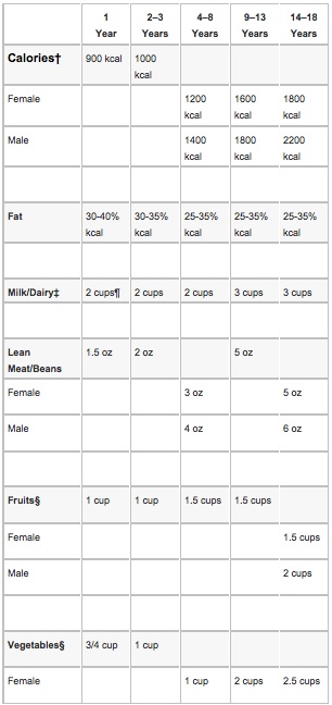 Daily Estimated Calories and Recommended Servings for Grains, Fruits, Vegetables, and Milk/Dairy by Age and Gender (Please speak with your child's pediatrician for a more personalized breakdown.)